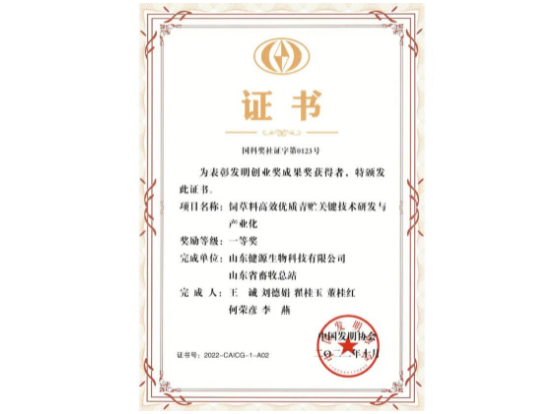 近日,在中國發明協會舉辦的“2022年度第三屆發明創業獎成果獎”全國評比中,山東健源生物科技有限公司《飼草料高效優質青貯關鍵技術研發與產業化》項目榮獲中國發明協會發明創業獎成果獎一等獎,標志著山東健源生物在發明創業獎成果獎上取得突破。