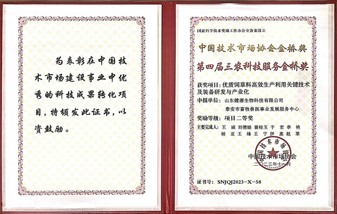 山東健源生物科技有限公司《優質飼草料高效生產利用關鍵技術及裝備研發與產業化》項目榮獲中國技術市場協會金橋獎第四屆三農科技服務獎項目二等獎。