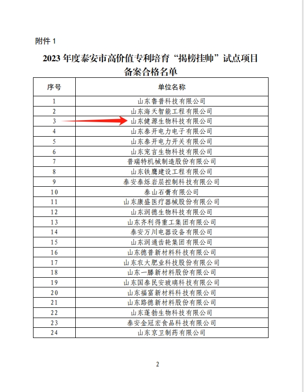日前,泰安市市場監督管理局根據《關于組織申報2023年度泰安市高價值專利培育“揭榜掛帥”試點項目的通知》要求,經過申報推薦、審核公示,我市24家單位符合備案資格。山東健源生物科技有限公司成功入選2023年度高價值專利培育“揭榜掛帥”試點項目備案合格名單。