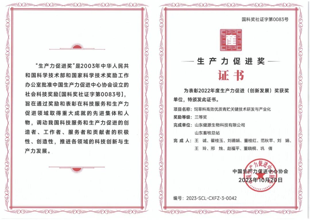 12月9日,2023中國生產力促進中心協會年會暨第十六屆寰宇生產力論壇生產力創新發展大會在北京成功召開,山東健源生物科技有限公司“飼草料高效優質青貯關鍵技術研發與產業化”項目榮獲2022年度生產力促進(創新發展)獎三等獎。