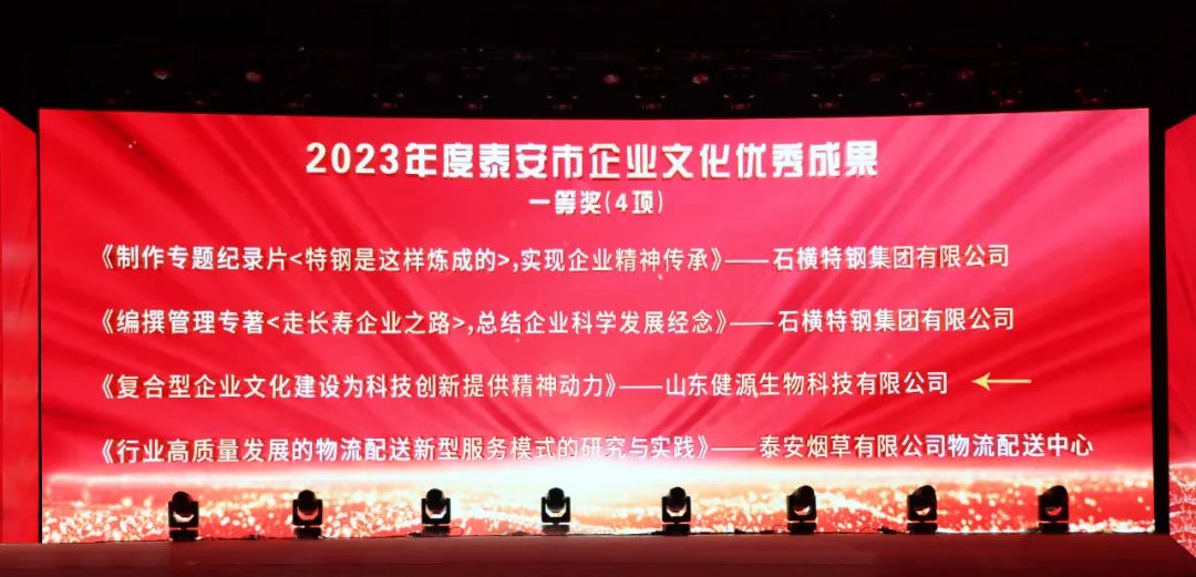 12月29日,2023迎新年銀企聯誼會暨2023年泰山企業家、泰安市“誠信工作先進企業”、 泰安市踐行社會責任愛心企業頒獎盛典隆重舉行。大會總結交流全市推進新型工業化和企業創新發展的成就與經驗,表彰先進。山東健源生物科技有限公司榮獲“泰安市企業文化優秀成果一等獎”、“泰安市誠信工作先進企業”、“泰安市踐行社會責任愛心企業”榮譽稱號。