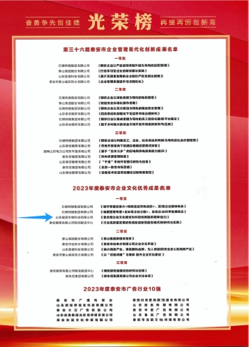 為進一步總結交流企業文化建設的新成果、新經驗,介紹企業文化建設的新方法、新特點,展示企業文化建設的新水平、新成就,經市企業文化優秀成果評委會審定,全市10項企業文化成果獲“2023年度泰安市企業文化優秀成果”獎,其中,一等獎4項。