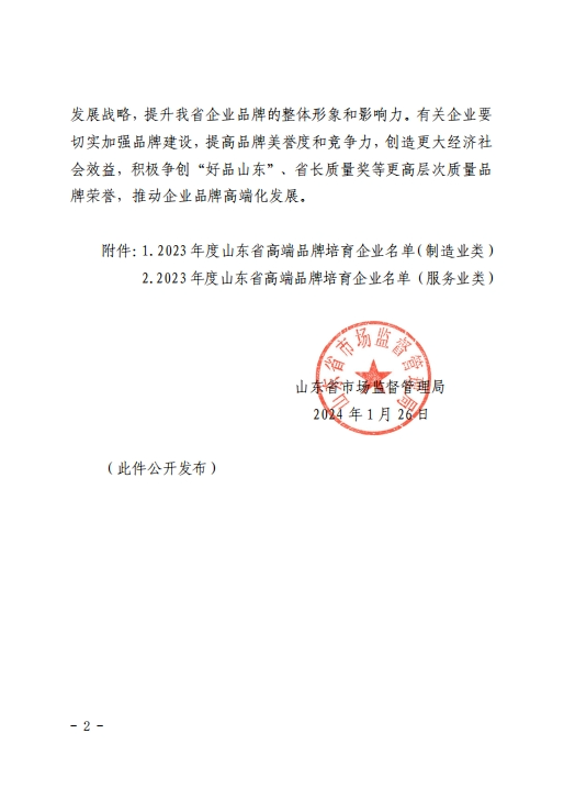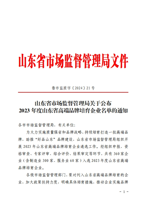 發布時間:[2024-2-4 8:44:32] 瀏覽量:3423次山東省市場監督管理局主持開展的山東省高端品牌培育企業評選工作是培育質量高、效益高、誠信度高、美譽度高的山東企業品牌,是深入實施質量強省及品牌戰略,共建共享“好品山東”,加快推進山東省品牌高端化進程的一項重要工作。經組織申報、資格審查、專家評審、綜合評價、結果審定等環節,共有360家企業(含制造業300家、服務業60家)入選2023年度山東省高端品牌培育企業。