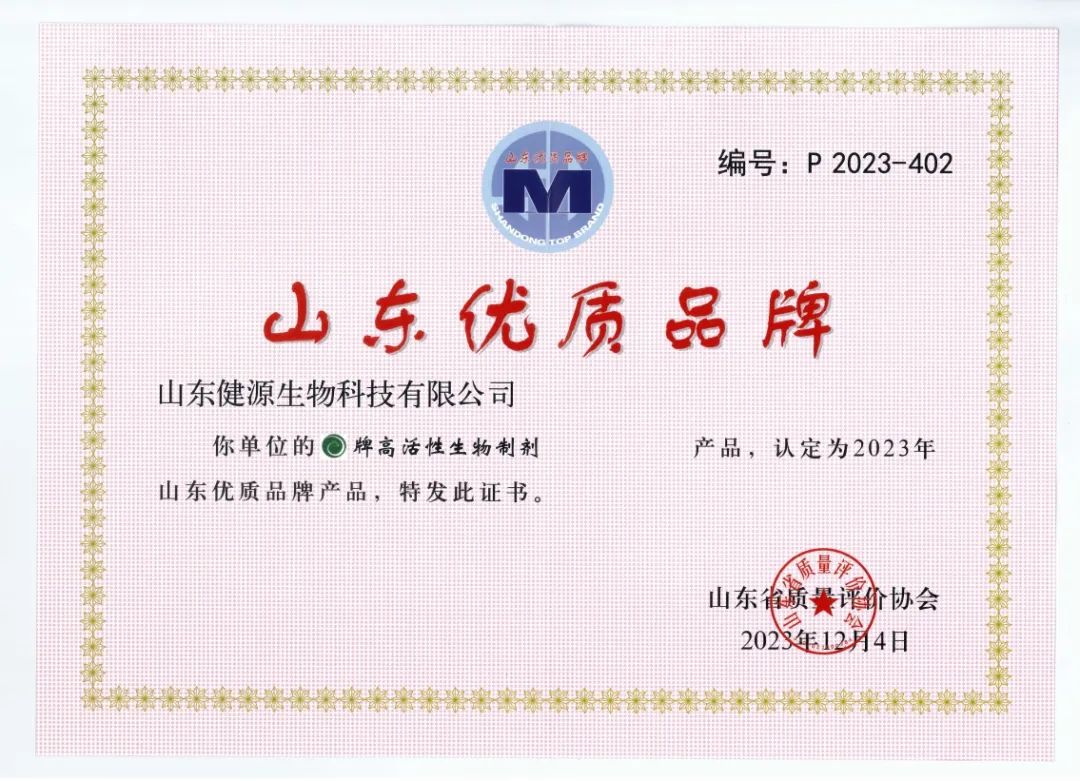 2023年12月,健源高活性生物制劑被山東省品牌建設促進會認定為2023年山東知名品牌。
