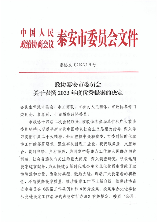 在會上,政協泰安市委員會發布了關于表揚2023年度優秀提案的決定,王誠董事長《關于留住駐泰院校人才,吸引外地人才來泰創業的建議》被選為優秀提案。