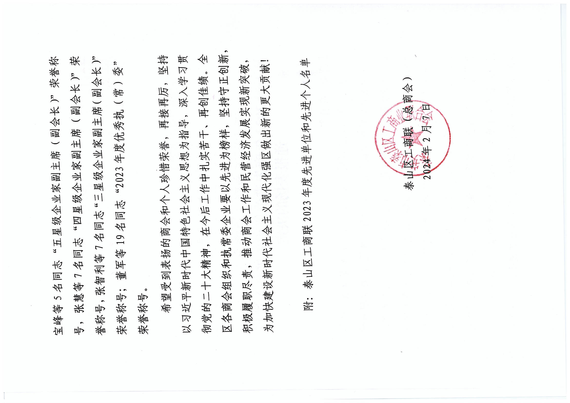 董事長王誠榮獲泰山區工商聯“2023年度優秀執(常)委”榮譽稱號