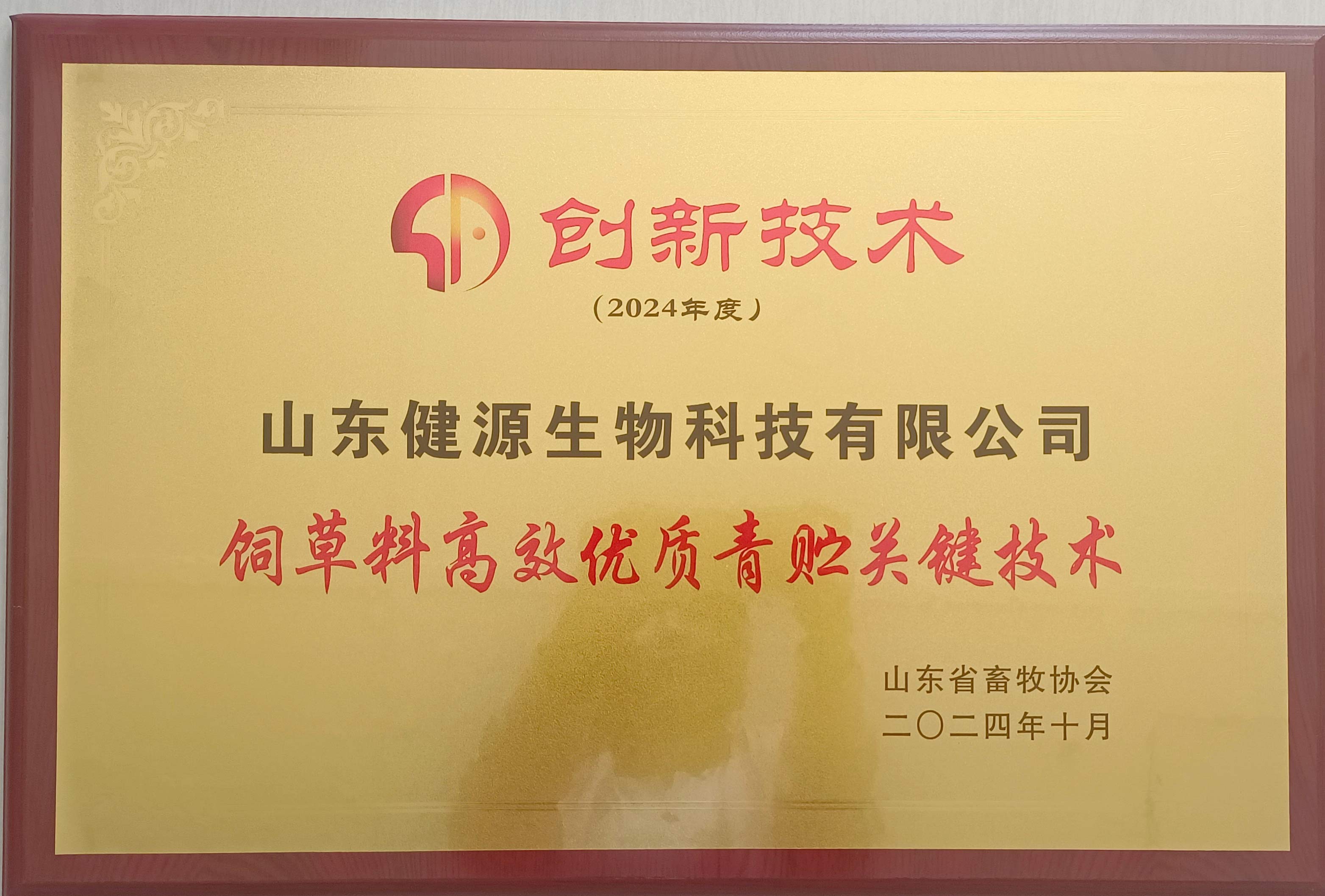 發布時間:[2024-10-28 16:47:34] 瀏覽量:2354次10月25日,山東省畜牧協會舉辦了“ 2024 草食畜禽高效生產與飼草飼料創新利用大會”,會上對草食畜禽“優良品種”“創新技術”和“高效模式”進行了頒獎。山東健源生物科技有限公司“飼草料高效優質青貯關鍵技術”榮獲2024年度山東省畜牧協會“創新技術”獎。